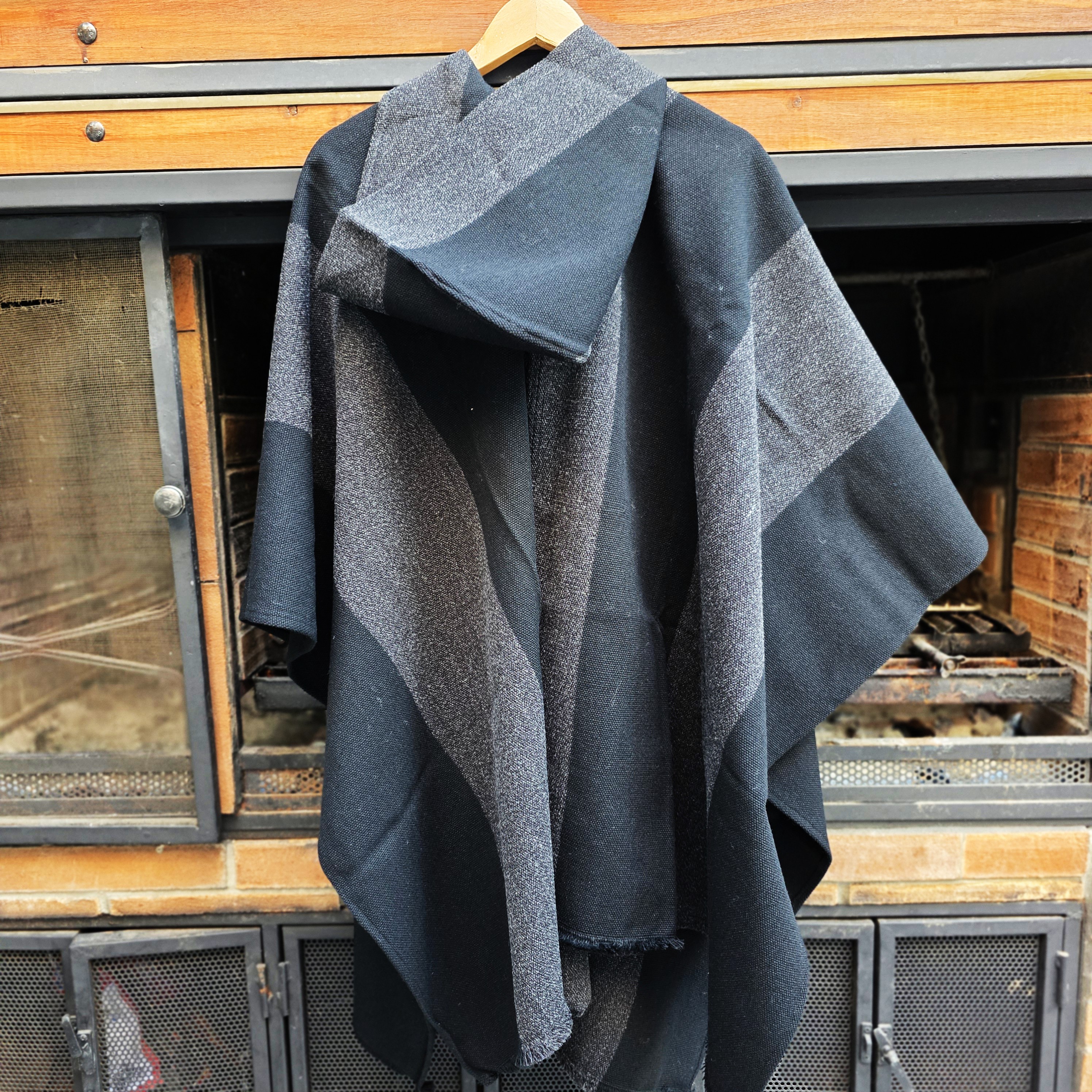 Poncho lana de oveja con franjas negras y grises y gorro